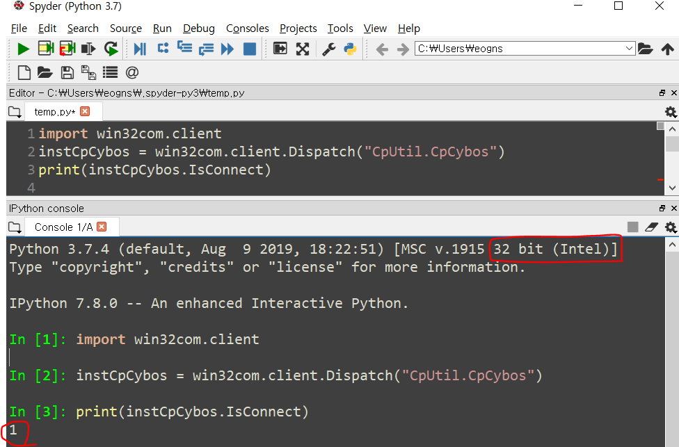 spyder(py_37_32) 를 관리자 권한으로 실행 후 아래 코드를 실행하여 접속 연결상태를 확인한다.